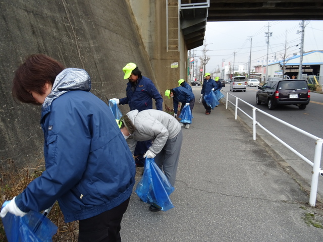 会社の前の道路及び矢作川左岸(JR東海道線~渡橋堤防)について道路清掃を実施しました。