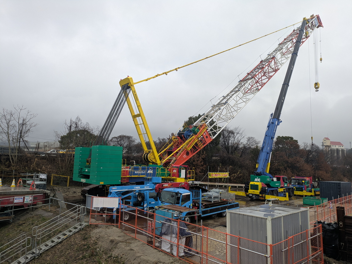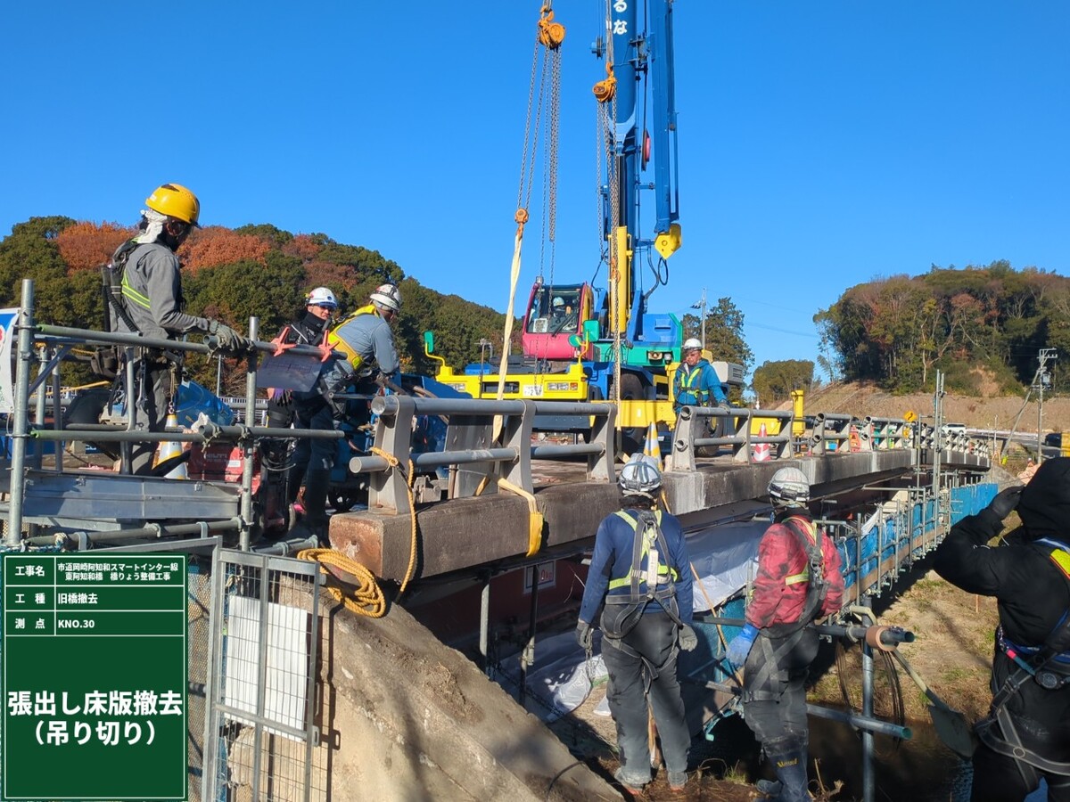 12月は、床板(張出部)の撤去と大型クレーンの組立が完了しました、1月より大型クレーンを使い橋桁の撤去を行います。