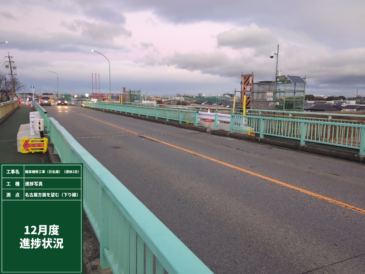 12月中旬より吊り足場設置を行います。1月初旬には、夜間車道通行止めによる覆工板設置及び仮舗装を行います。