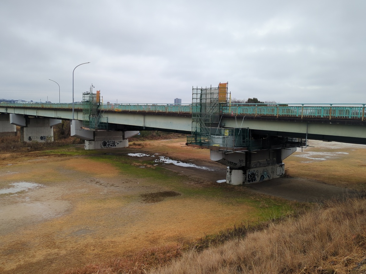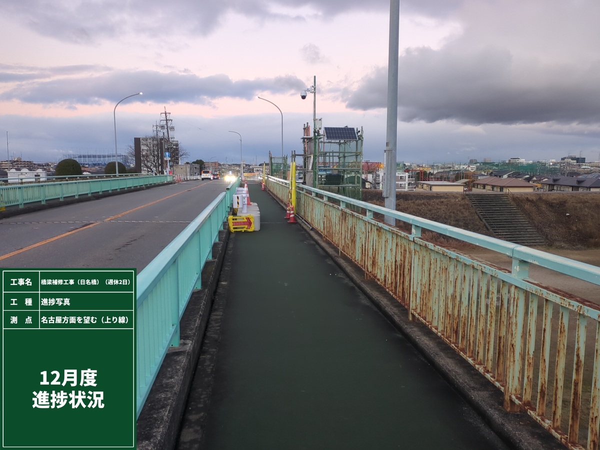 12月は吊り足場及び仮設防護柵の設置を行いました。1月は、夜間車道通行止めによる覆工板設置及び仮舗装を行います。その後夜間片側交互通行にて床版撤去及び連結工事を行います。