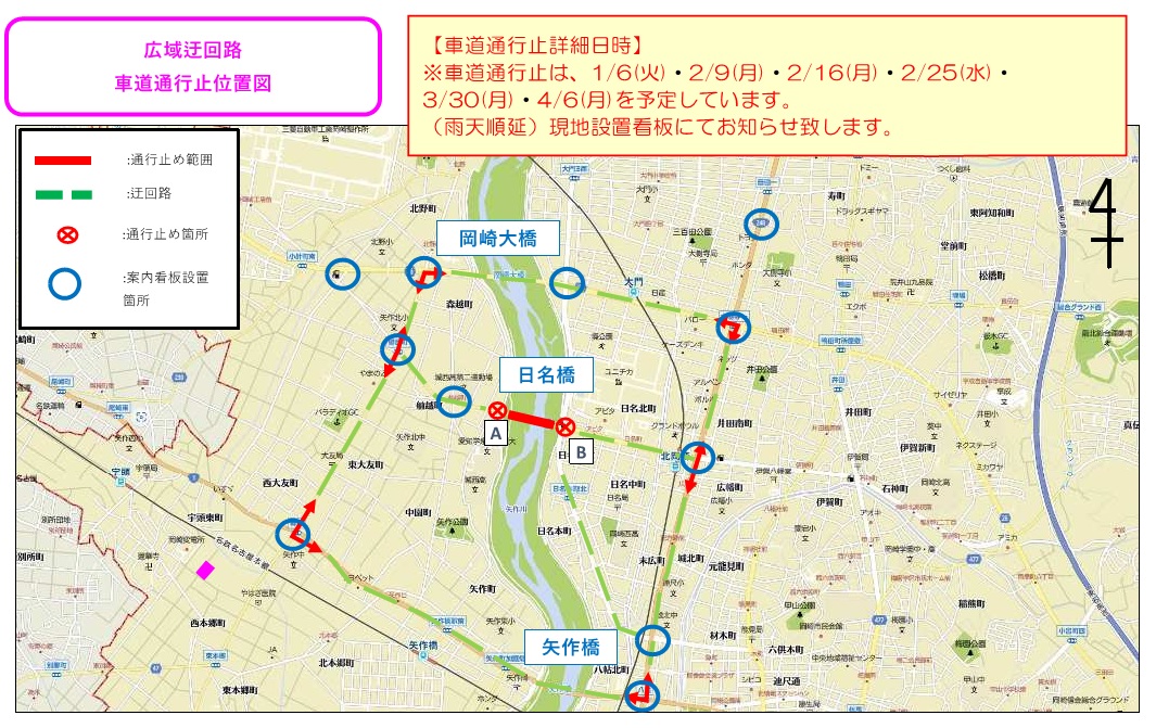 日名橋は、一級河川矢作川に架かる橋長381mの10径間ゲルバー鈑桁橋です。本工事は、日名橋の上部工床版連続化を行う工事で、作業時間は21時から翌5時までの夜間工事です。交通規制方法は、基本的には夜間片側交互通行ですが、夜間車道通行止めを計6回行います。