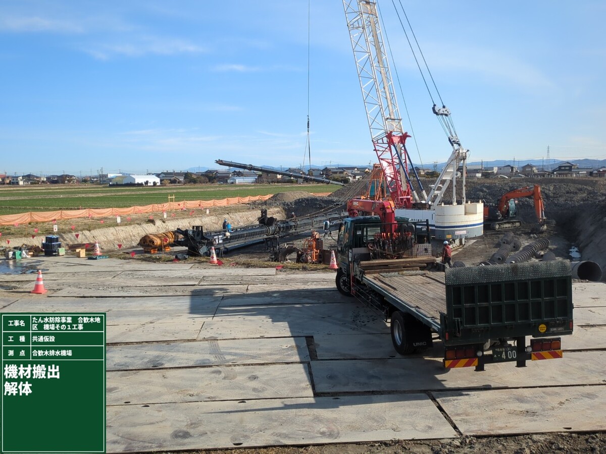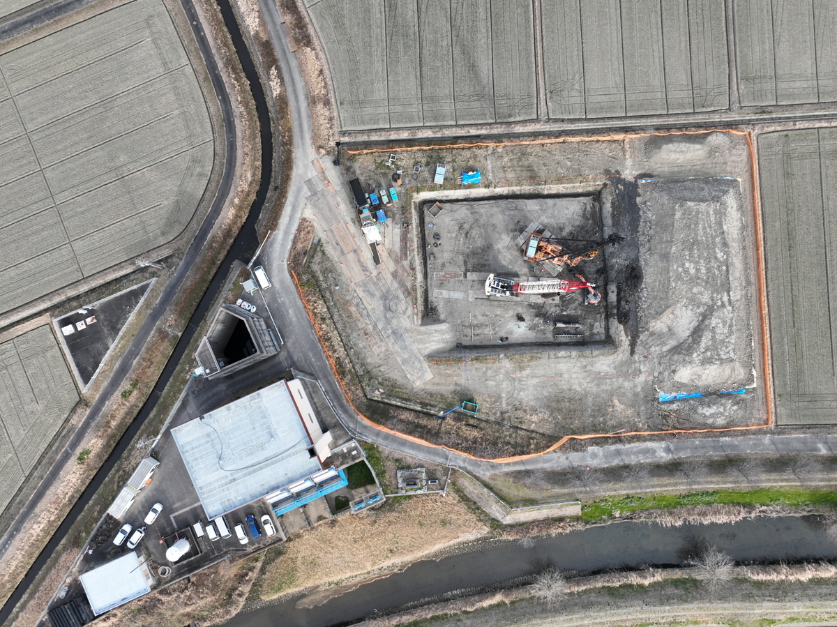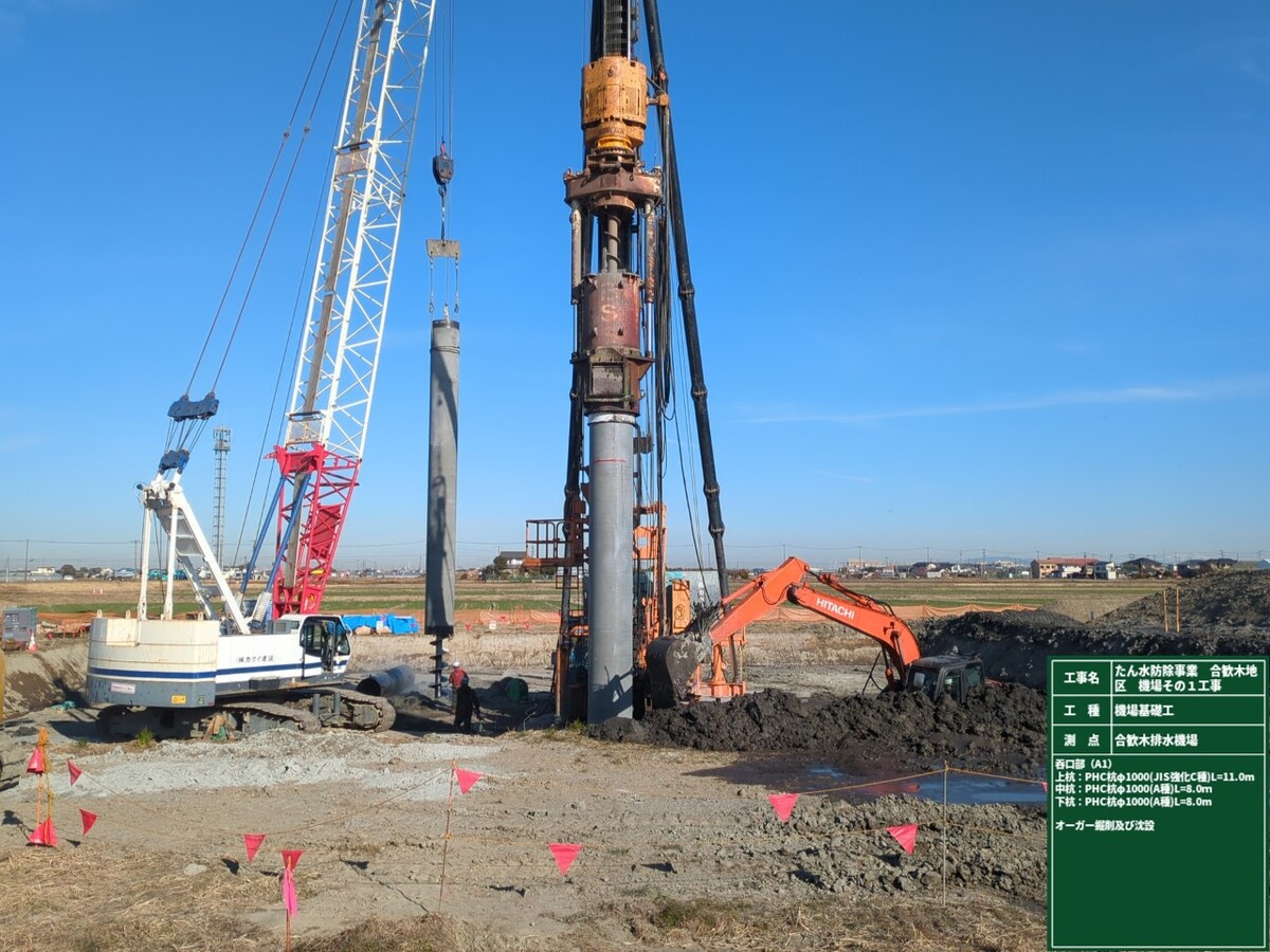 - 本工事は、竣工から約40年経過し、地域の開発やポンプ能力の低下などがみられる合歓木排水機場の作りなおしのための基礎杭工事です。