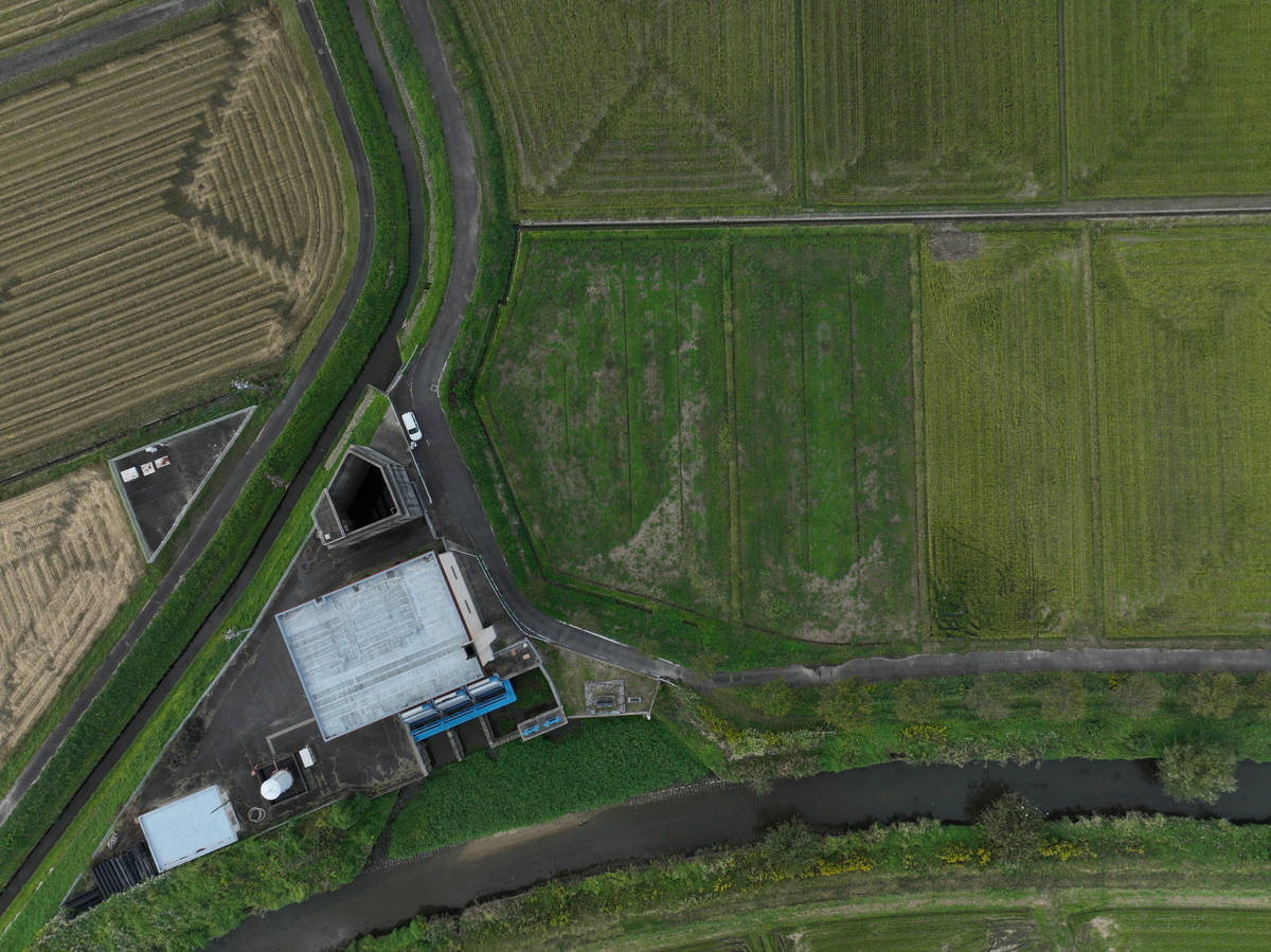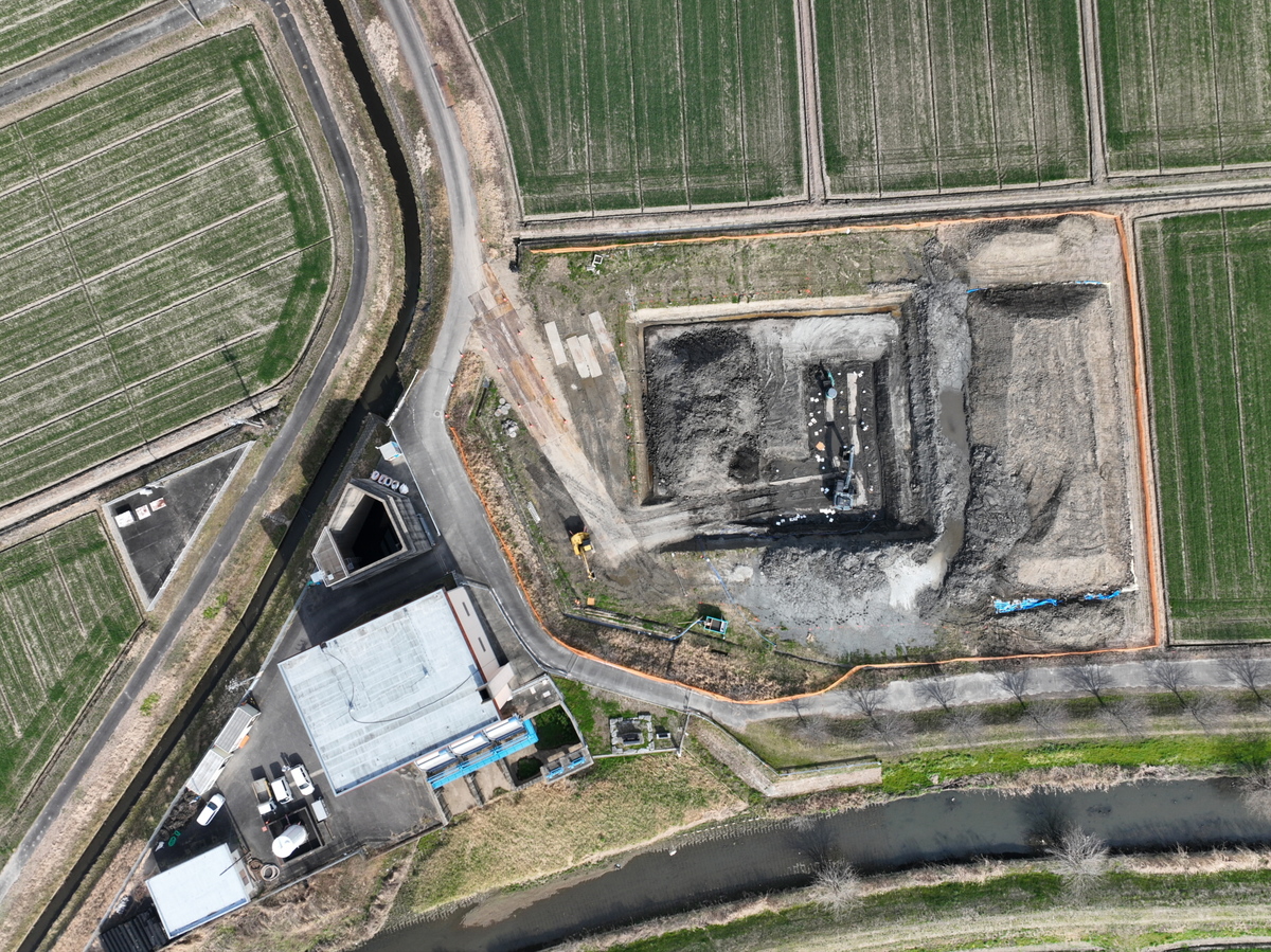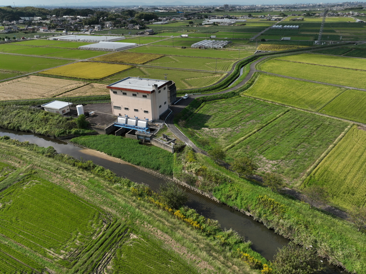 - 本工事は、竣工から約40年経過し、地域の開発やポンプ能力の低下などがみられる合歓木排水機場の作りなおしのための基礎杭工事です。