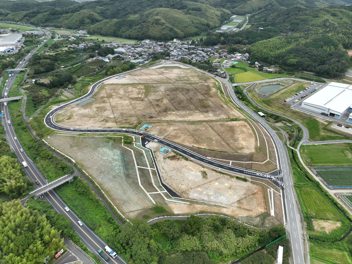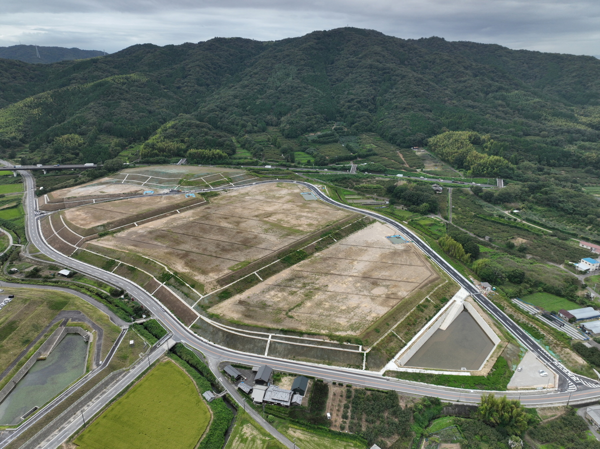 盛土が約16.4万m3の比較的大きな造成工事であるため、土埃等の粉塵や降雨時の濁水流出防止等、周辺の環境に配慮した施工が求められています。